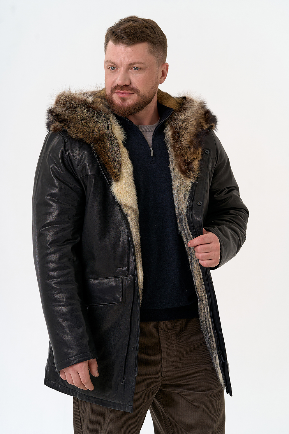 Тип ворота - капюшон, отделка мех енота